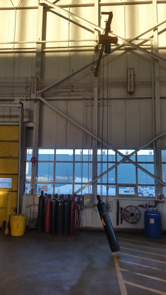 We were able to retrofit this aircraft hanger with a suitably sized, wall mounted Jib Crane. The customer had in place an older, manual, chain driven hoist for lifting compressed Nitrogen gas cylinders on and off of their service vehicles, which was outdated and clumsy. The original crane was disassembled and removed. The new, 1 ton, Jib Crane which utilizes an electric hoist for easy, one person loading and off loading of the cylinders was installed. The Jib Crane was attached to the steel structure of the building quickly with no disruption to service in the hangar. The Jib Hoist will provide an easy to use, versatile assist for years to come with very light maintenance.